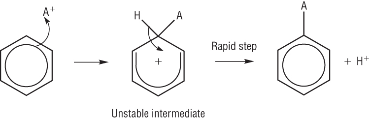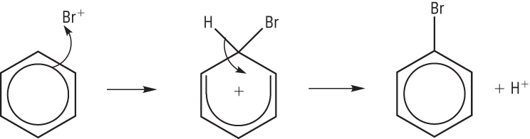 A pair of electrons move from the ring to the electrophile forming a covalent bond.