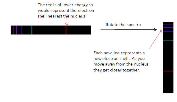 This gives us the series of lines as electrons give out only specific energy when they move to a lower electron shell.