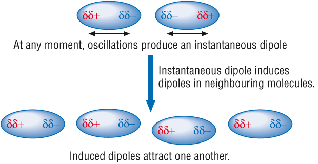 The negative end of the dipole induces a dipole of opposite charge in neighbouring atoms