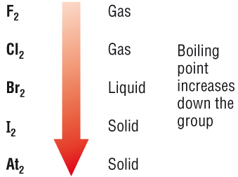 The melting and boiling point of the halogens increases with atomic number due to increased van der Waals.