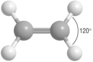 The p bond changes the shape around the carbon atom to a trigonal planar with a bond angle of 120o: