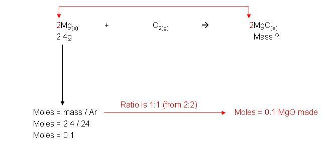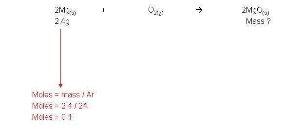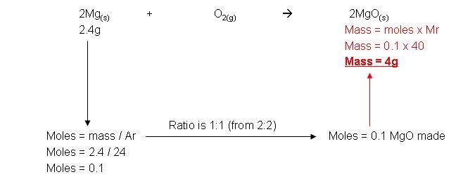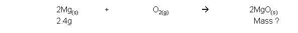 · Example: 2.4g Magnesium reacts in air to form magnesium oxide. Calculate the mass of magnesium oxide made:
