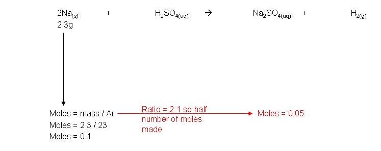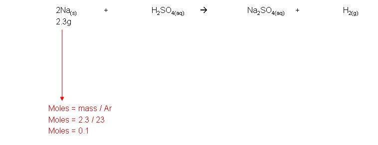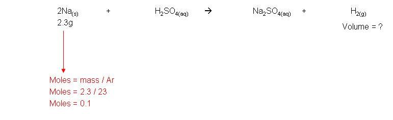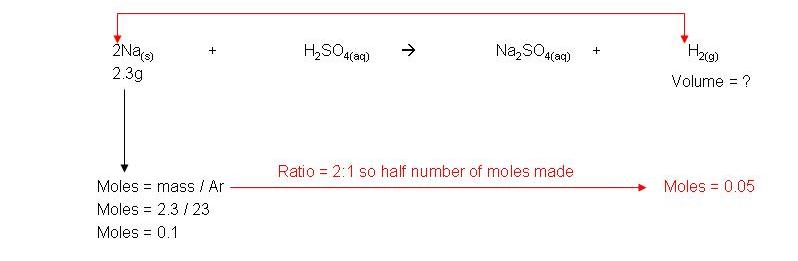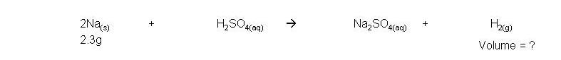 · Example: 2.3g sodium reacts with excess sulphuric acid to form sodium sulphate and hydrogen gas. Calculate the volume of hydrogen made:
